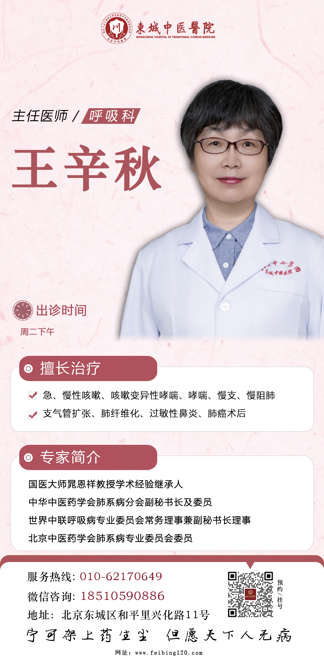 中医内科(呼吸)王辛秋主任医师:5月5日周二下午停诊一次诊室306(周二下午)